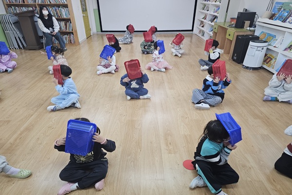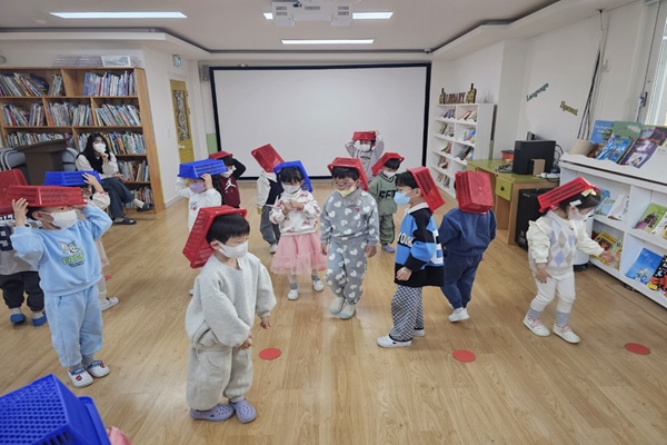 바구니 얼굴에 가려서 친구들과 함께 인사해보기!